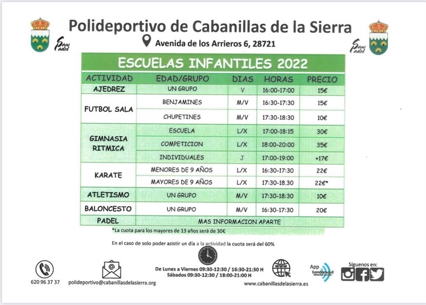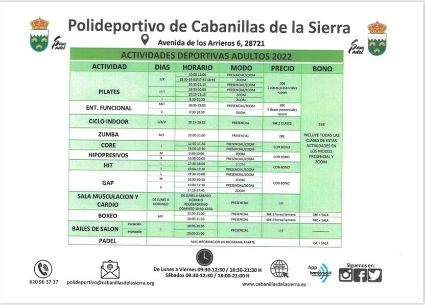 Deportes 28 febrero 2023 Visto: 650 Descuentos del 30% en gimnasio y actividades que se desarrollan en las instalaciones deportivas de Cabanillas de la Sierra Leer más...