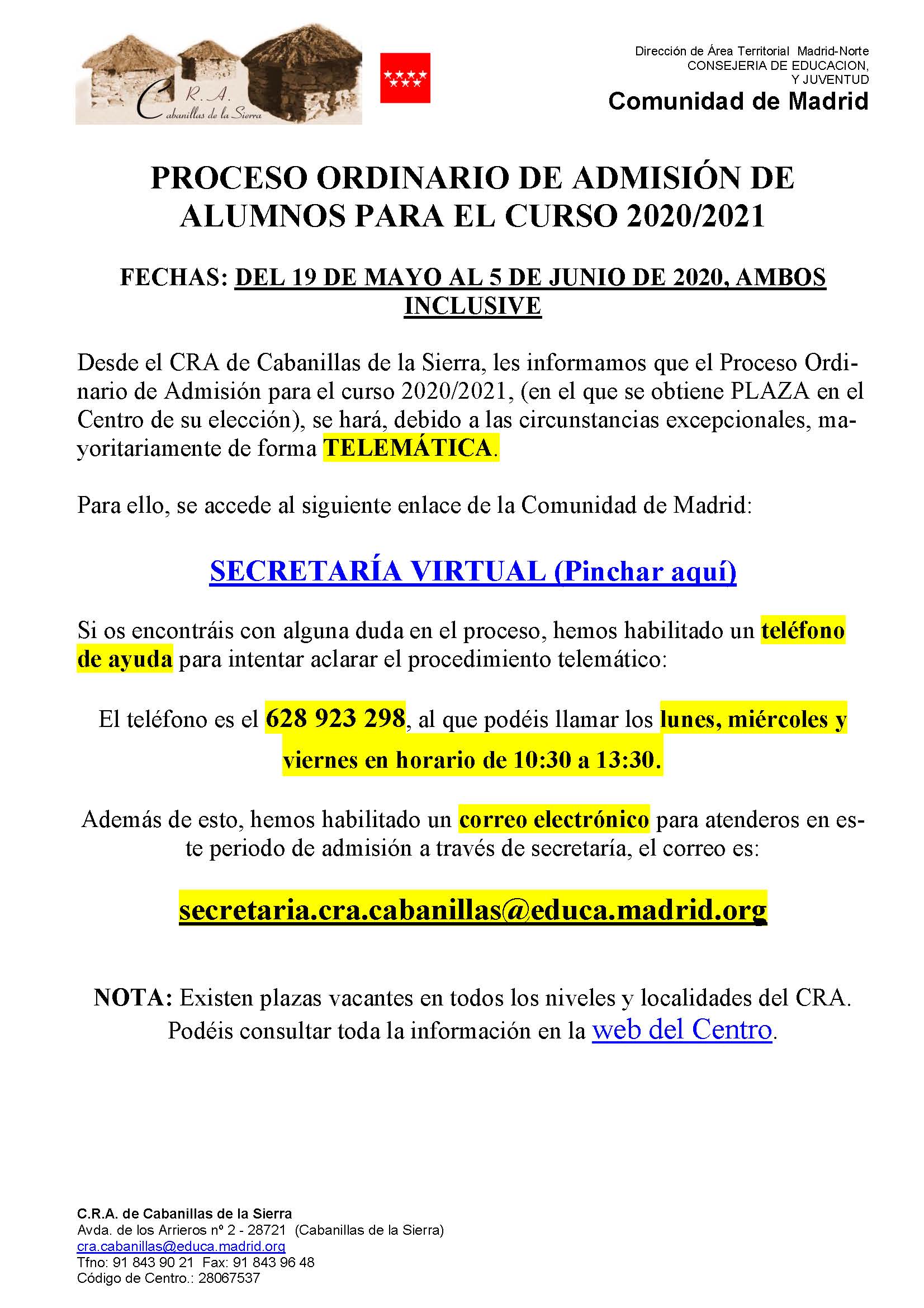 Educación 19 mayo 2020 Visto: 1343 Proceso ordinario de admisión de alumnos CRA Cabanillas de la Sierra, curso 2020/2021 Leer más...