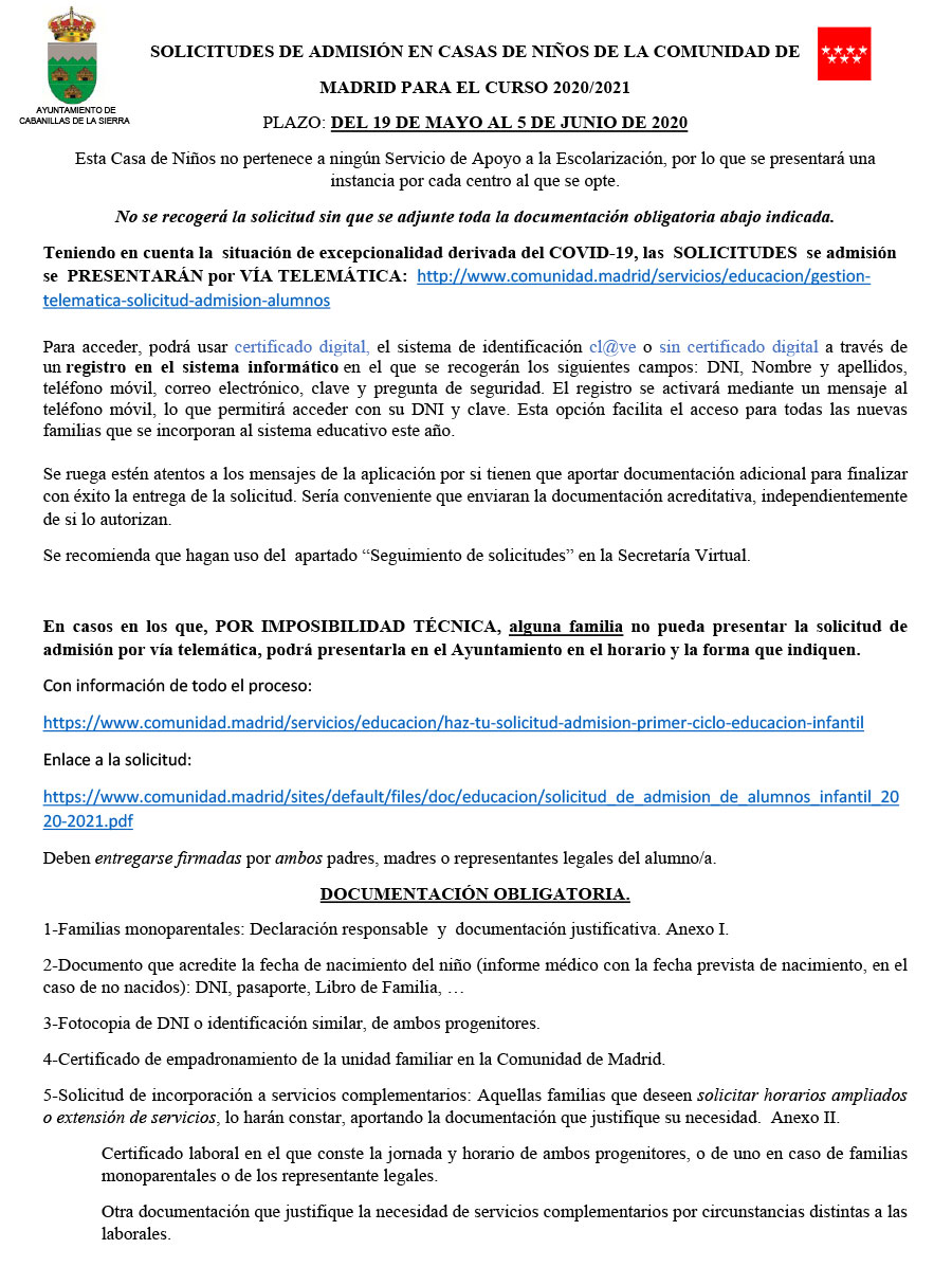 Educación 14 mayo 2020 Visto: 1708 Solicitudes de admisión en Casas de Niños de la Comunidad de Madrid para el curso 2020/2021 Leer más...