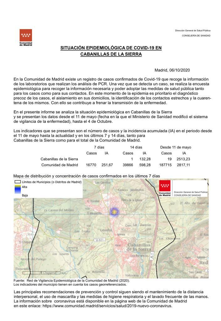 Salud 08 octubre 2020 Visto: 989 Situación epidemiológica de Covid-19 en Cabanillas de la Sierra a 06/10/2020 Leer más...