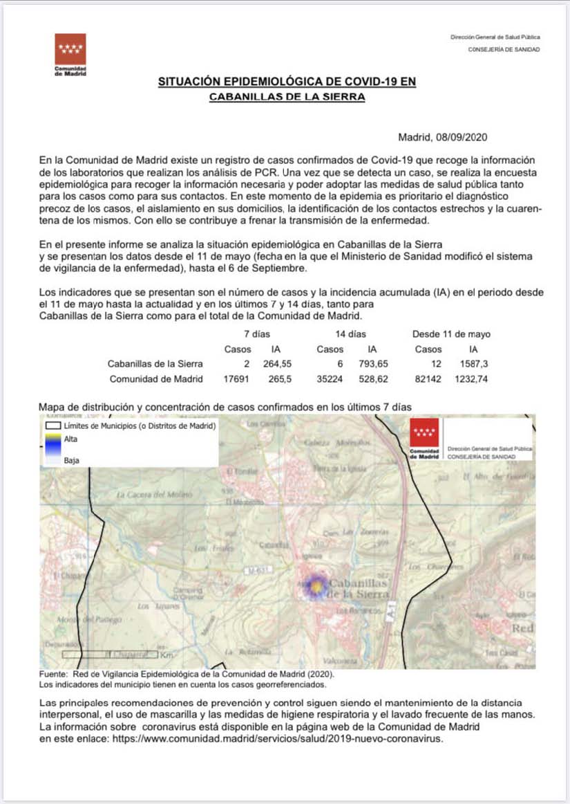 Salud 24 septiembre 2020 Visto: 824 Situación epidemiológica de Covid-19 en Cabanillas de la Sierra, a 22 de septiembre Leer más...